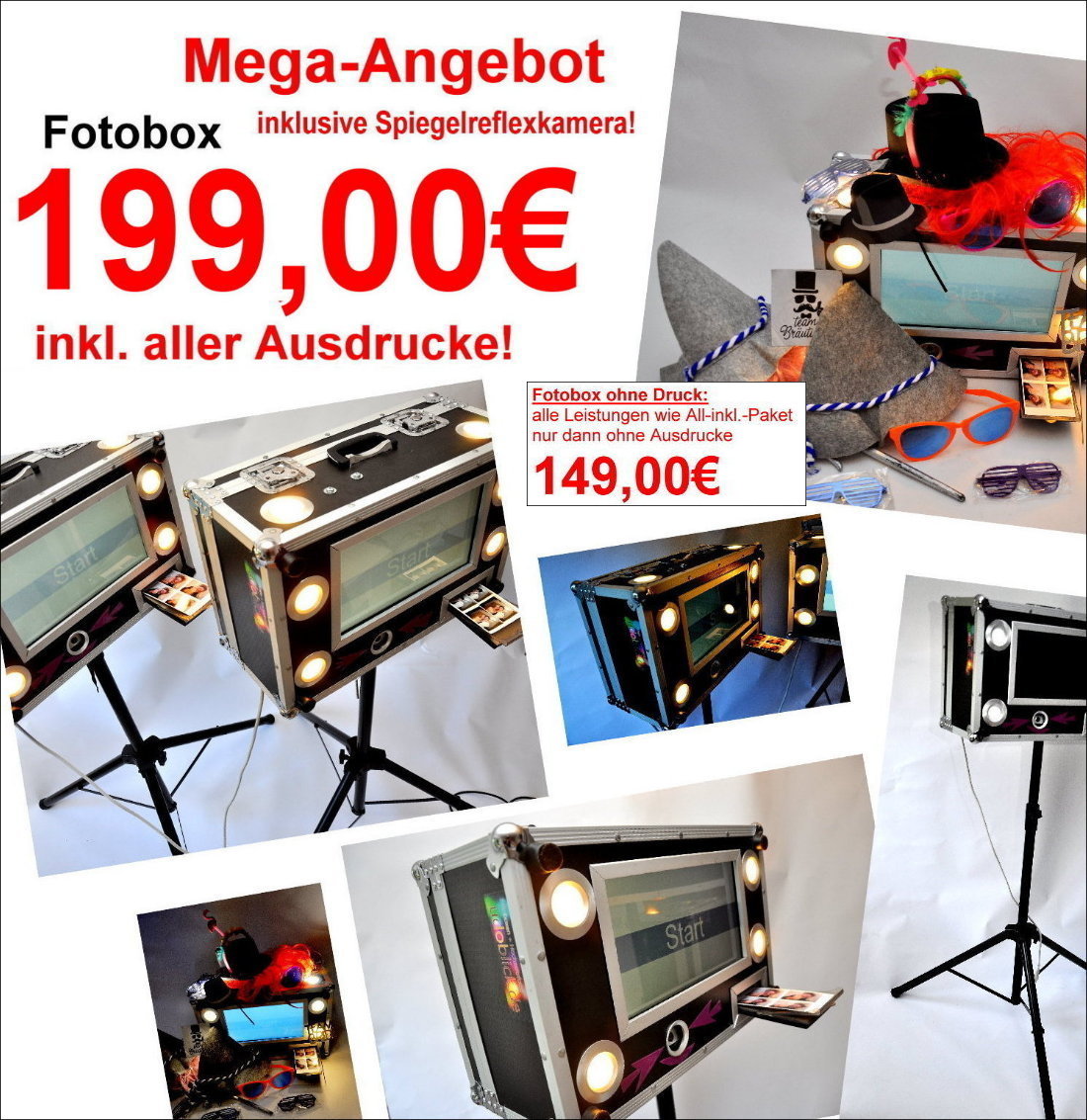 Wir bieten Miet-Fotoboxen inkl. Spiegelreflexkamera, inkl. Flatrate-Druck ohne Limit, Versand, USB-Stick, Accessoires uvm… Mega-Angebot!