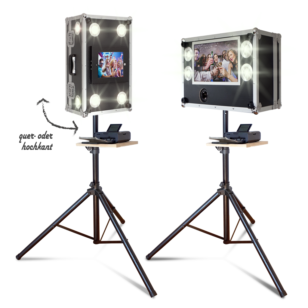 Das Stativ wird einfach auf der gewünschten Höhe arretiert und die Fotobox oben aufgesetzt. Bei der iPad-Version und einigen Spiegelreflex-Modellen steht der Drucker separat und wird über ein USB-Kabel mit der Box verbunden. Danach einfach die Fotobox an die Steckdose anschließen und los geht´s.